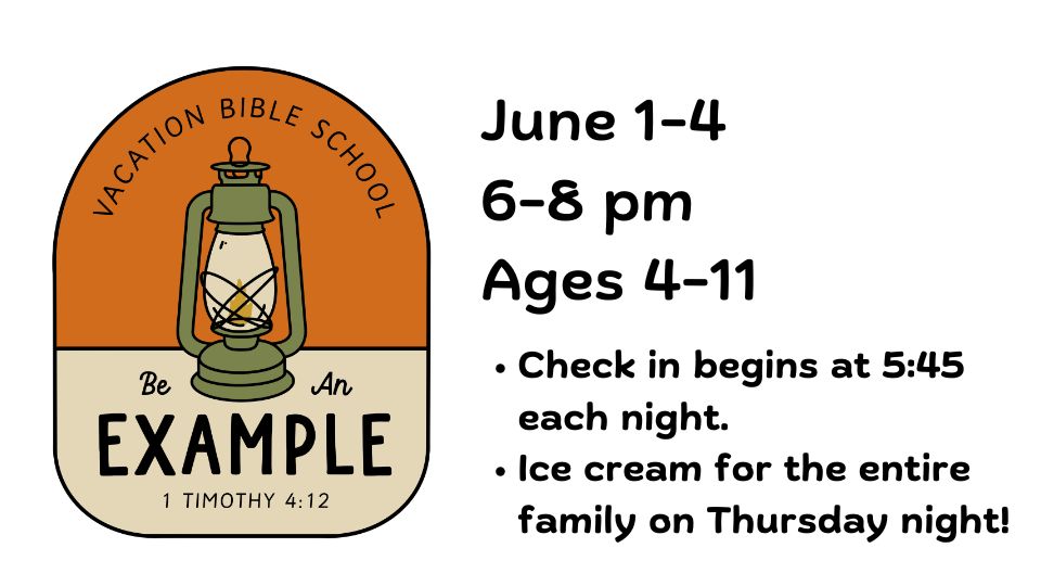 VBS is Monday June 1 through Thursday June 4 from 6:00 pm until 8:00 pm each night.